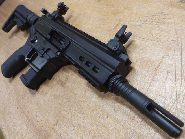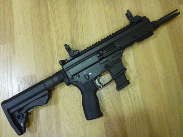 Cette arme compact est un mélange d’ergonomie entre un AR9 (poignée, crosse, levier armement…) et un stribog (boitier supérieur carré). Le gros avantage de ce modèle, c’est qu’il accepte les chargeurs de type Glock.