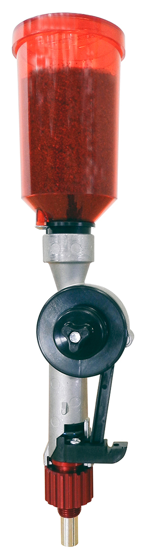 Doseur de poudre automatique Deluxe avec nouvel adaptateur pivotant anodisé rouge qui offre une plus grande zone de préhension pour l’ajustement dans votre presse, et soulève le doseur de poudre pour dégager les matrices les plus hautes et élimine le besoin de la colonne montante.