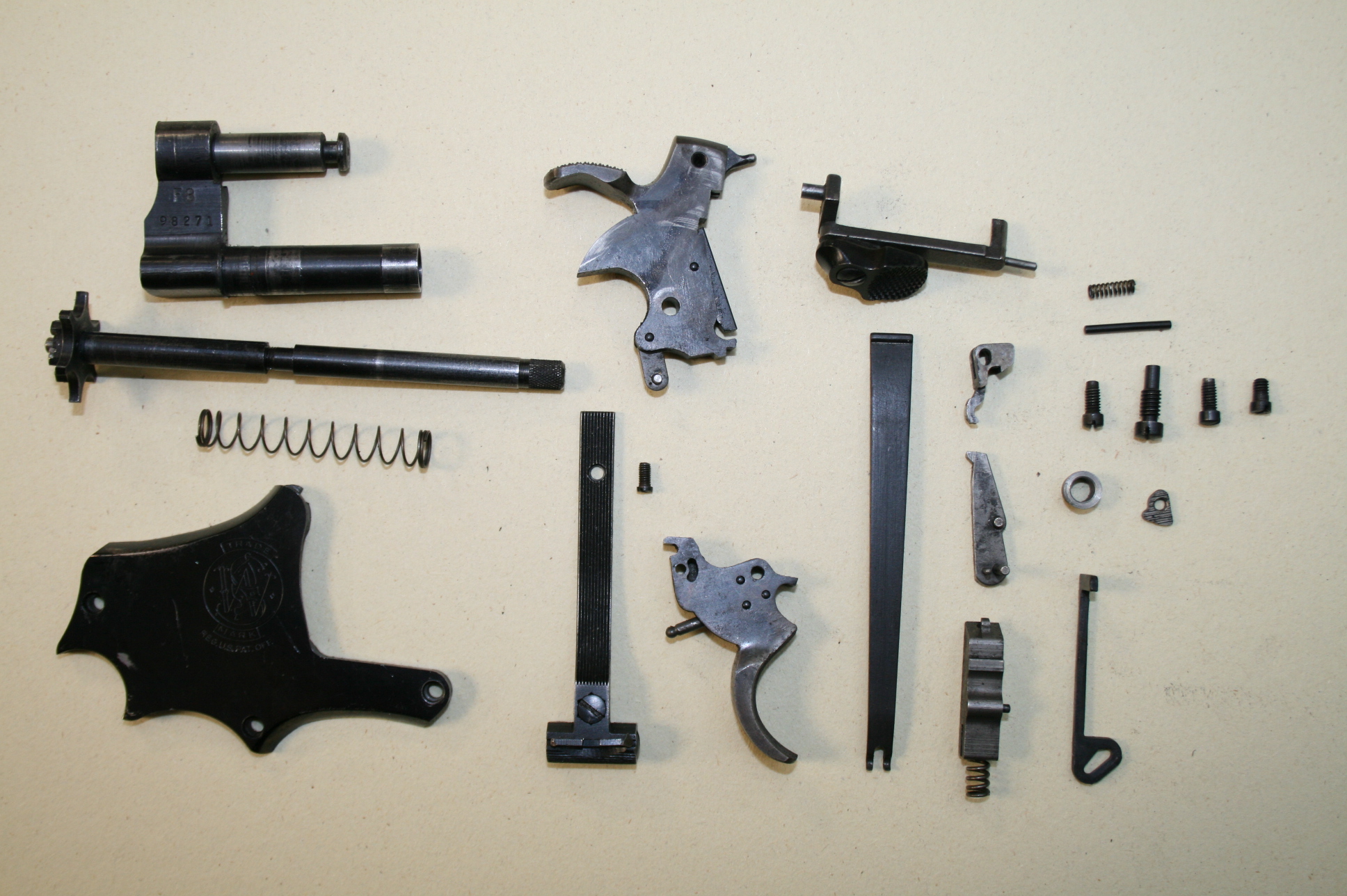 Marteau, détente, hausse, extracteur, goupilles, vis, barre de sécurité, plaque de recouvrement latérale, ressorts, levier d’ouverture, élévateur, verrou …