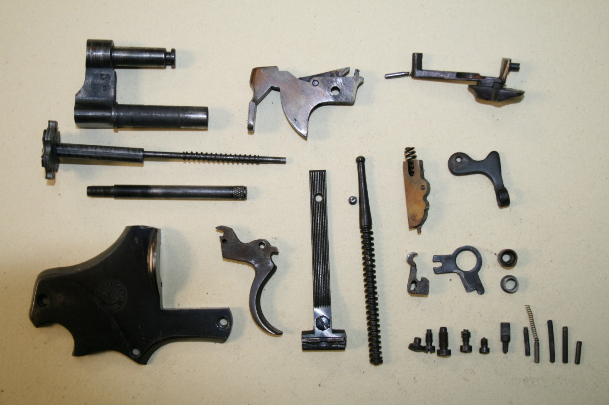 Marteau, détente, hausse, extracteur, goupilles, vis, plaque de recouvrement latérale, ressorts, levier d’ouverture, élévateur, verrou …