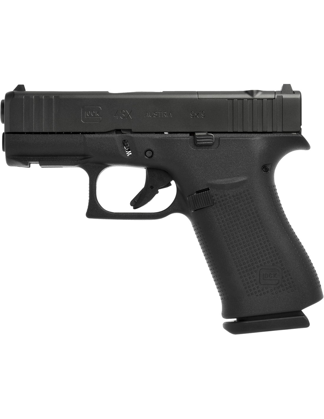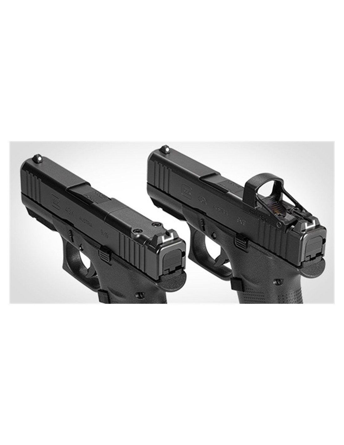 Dernière version subcompact et slimline de la firme Glock doté d’un chargeur de 10 coups en 9x19mm, en simple pile permettant d’avoir une carcasse un peu plus longue que le 43 standard tout en gardant une arme peu épaisse.