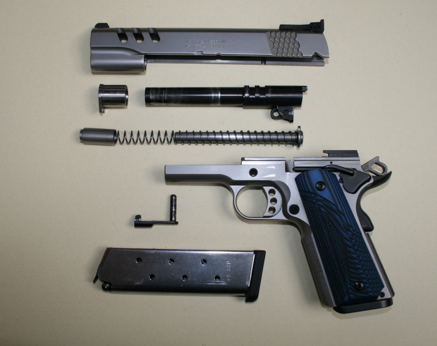Action : simple action et en finition Performance Center (PC) : glissière usiné 3 stries, plaquettes G10 bois bleu personnalisées, préparation du départ , polissage des pièces.