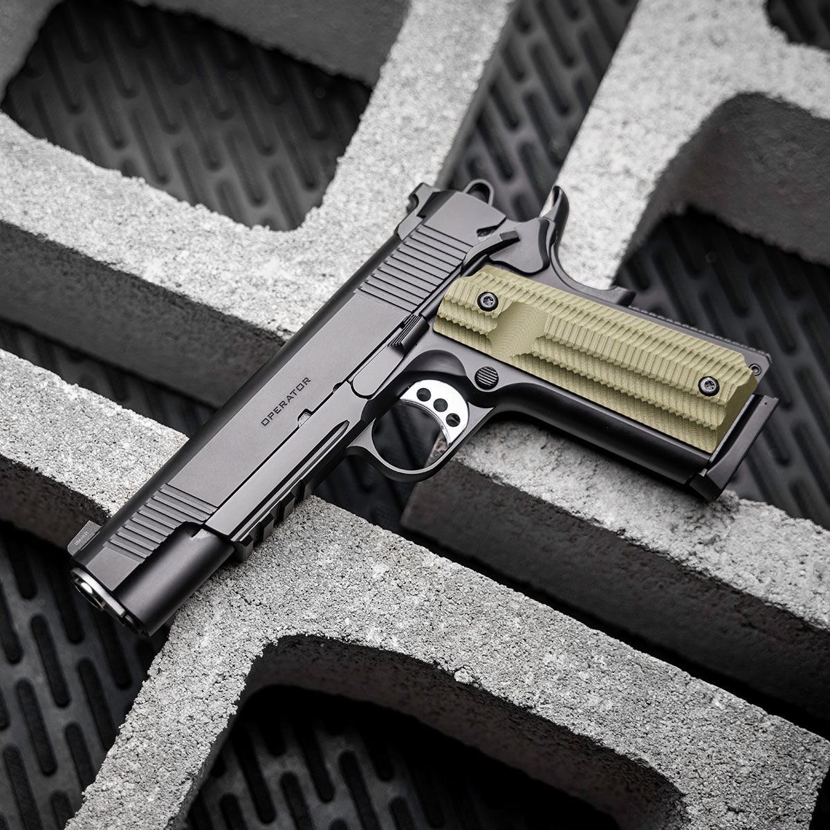 -Alliant esthétique et surface antidérapante, les poignées G10 du fabricant réputé VZ Grips® complètent l’équipement de qualité tactique du pistolet Operator® 1911. Dotées de rainures profondes pour une interface solide entre votre main et le pistolet, les poignées G10 de l’Operator complètent parfaitement la robustesse et la durabilité du 1911.