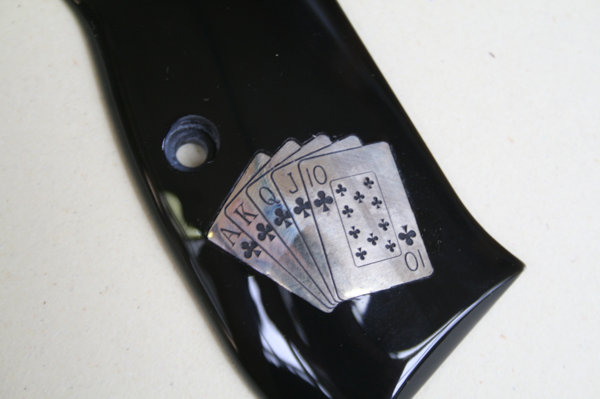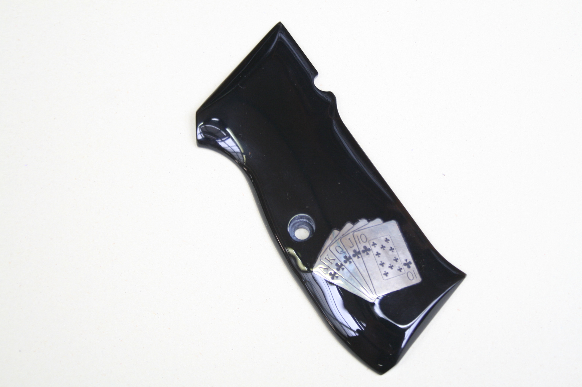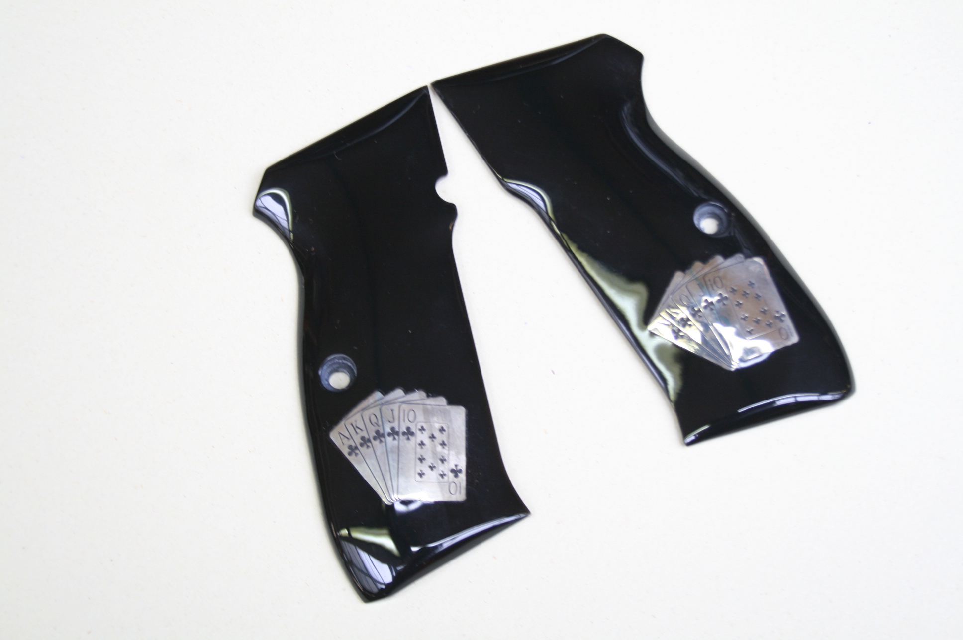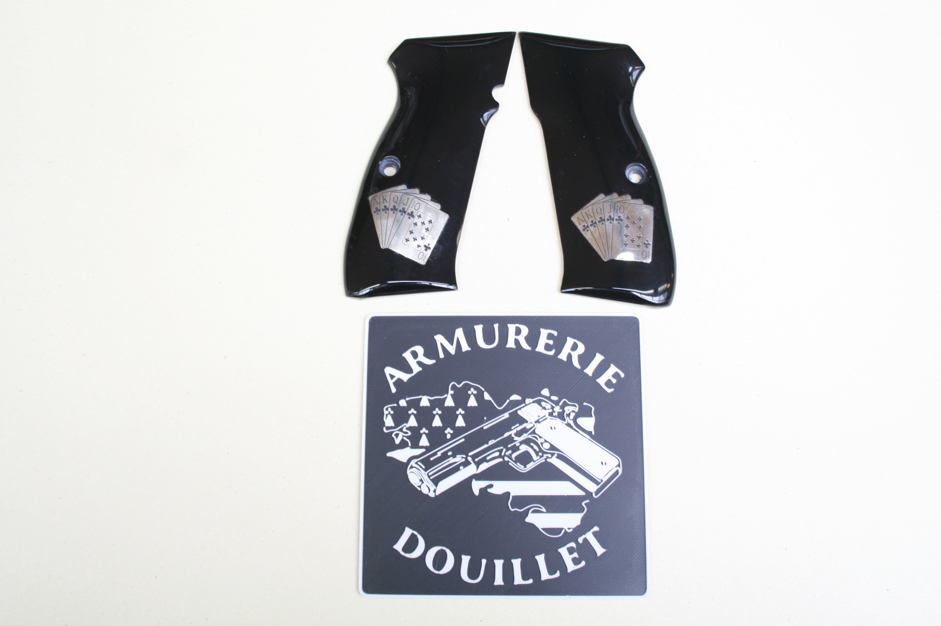 Plaquettes pour pistolets CZ 75, 85 ou Shadow 1, en plastique noir avec décorations de cartes à jouer dorées.