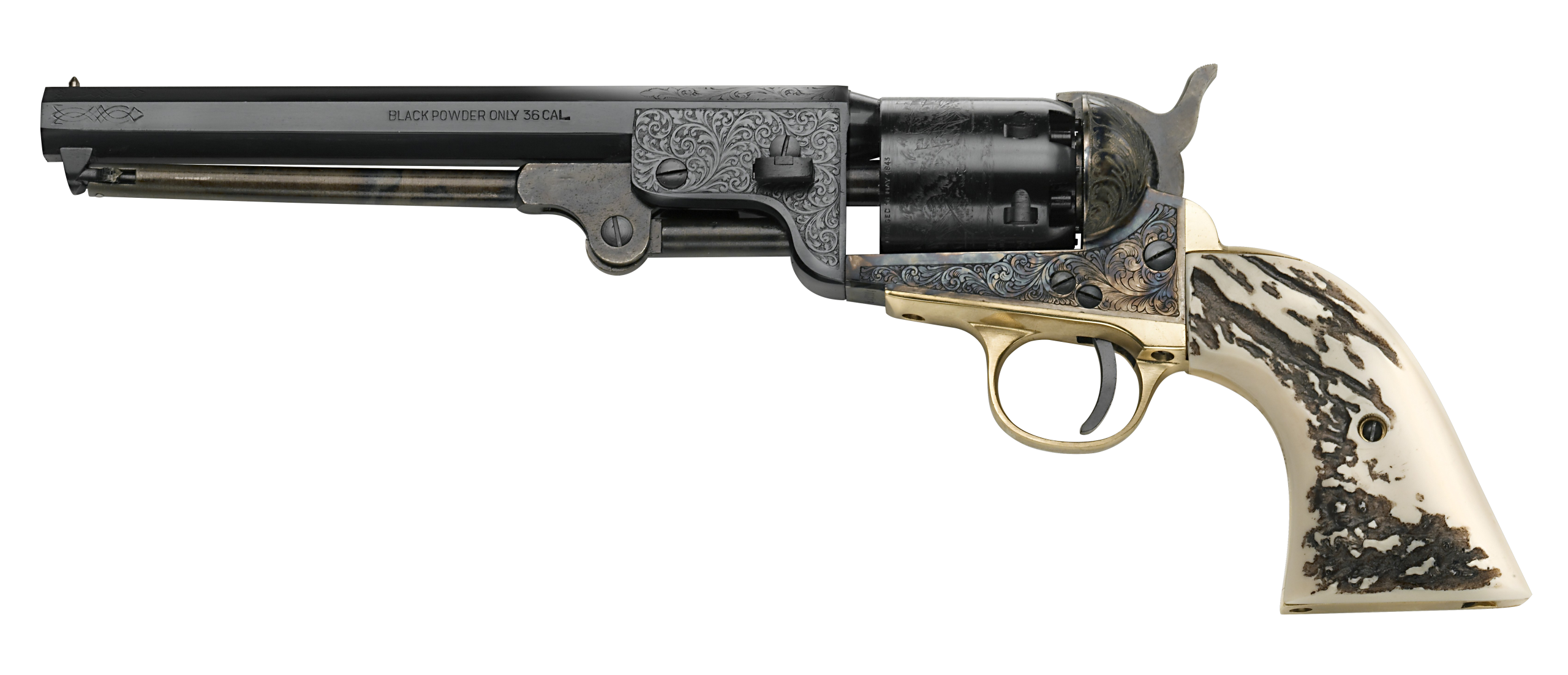 Edition Limitée du fameux revolver Colt 1851 Navy Yank en acier gravé. Arme à poudre noire, fiable considérée comme le meilleur révolver simple action de son époque.
