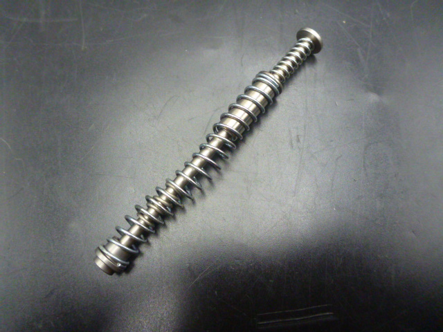 Ce système fonctionne à l’aide de ressorts imbriqués : le ressort principal qui a la même fonction que le ressort récupérateur d’origine, le ressort secondaire qui amorti la course de la culasse (et qui, par conséquent, protège la carcasse ) et le 3ème ressort qui se trouve à l’intérieur de la tige guide et qui constitue à la fois un dernier amortissement tout en protégeant le système lui-même ( la tige guide interne fini sa course sur ce ressort qui se trouve au fond d’un fourreau entourant la tige guide).